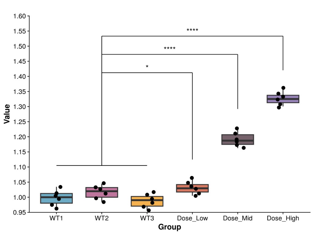 対照群と複数処理群を比較した例です。箱ひげ図・ジッター・有意差ブラケットを、R のインストールやコーディングなしで再現できます。